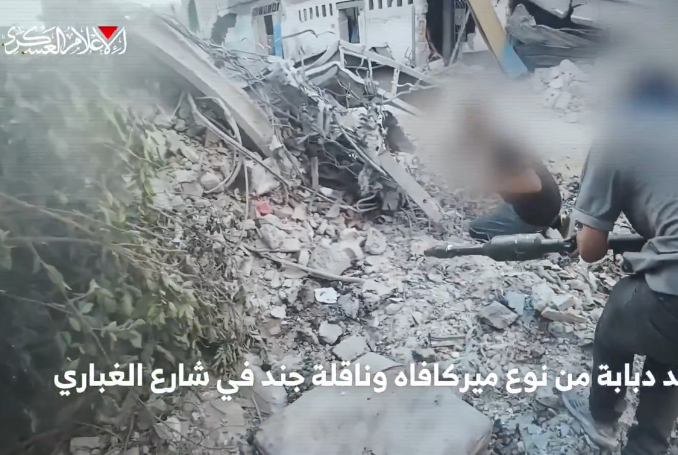 The footage shows three Qassam fighters emerging from a destroyed house to strike a Merkava tank and an armored personnel carrier on Al-Ghabari Street. One fighter fired a “Yasin 105” shell at the tank, while another planted an explosive device on the armored vehicle before withdrawing.