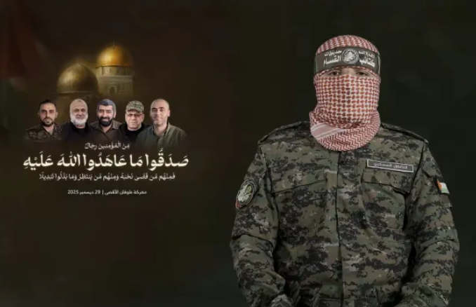 By Palestine Chronicle Staff The newly introduced military spokesman of the Al-Qassam Brigades delivered his first public address, announcing the killing of the former spokesman and outlining the movement’s position on the war, ceasefire, … Continue reading ‘We Pledge to Continue the Path’: Full Speech by Newly Introduced Abu Obeida